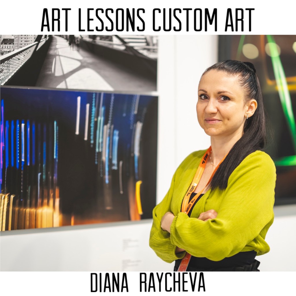 Diana Raycheva – ArtLessons Custom Art is highly qualified multi awarded established Artist, photographer, art teacher for kids and adults, custom designer, storyboard artist with more than 15 y experience.Painting is something Diana has done since 2 y old. She gets inspired from the nature, the human body, architecture. She keeps the original signature showing her own emotions, feelings in colours, shapes stylisation and balanced composition. The balance between soft and hard shapes, black and white, grey nuances, colourful palette, light and darkness. Moreover she express the woman’s and man’s energy contrast and synergy. She underline the cold and hot nuances and the strength of the human connection with the nature and the limitless space. Her unique style combines a modern vision and technique that make her works impactful and recognisable..