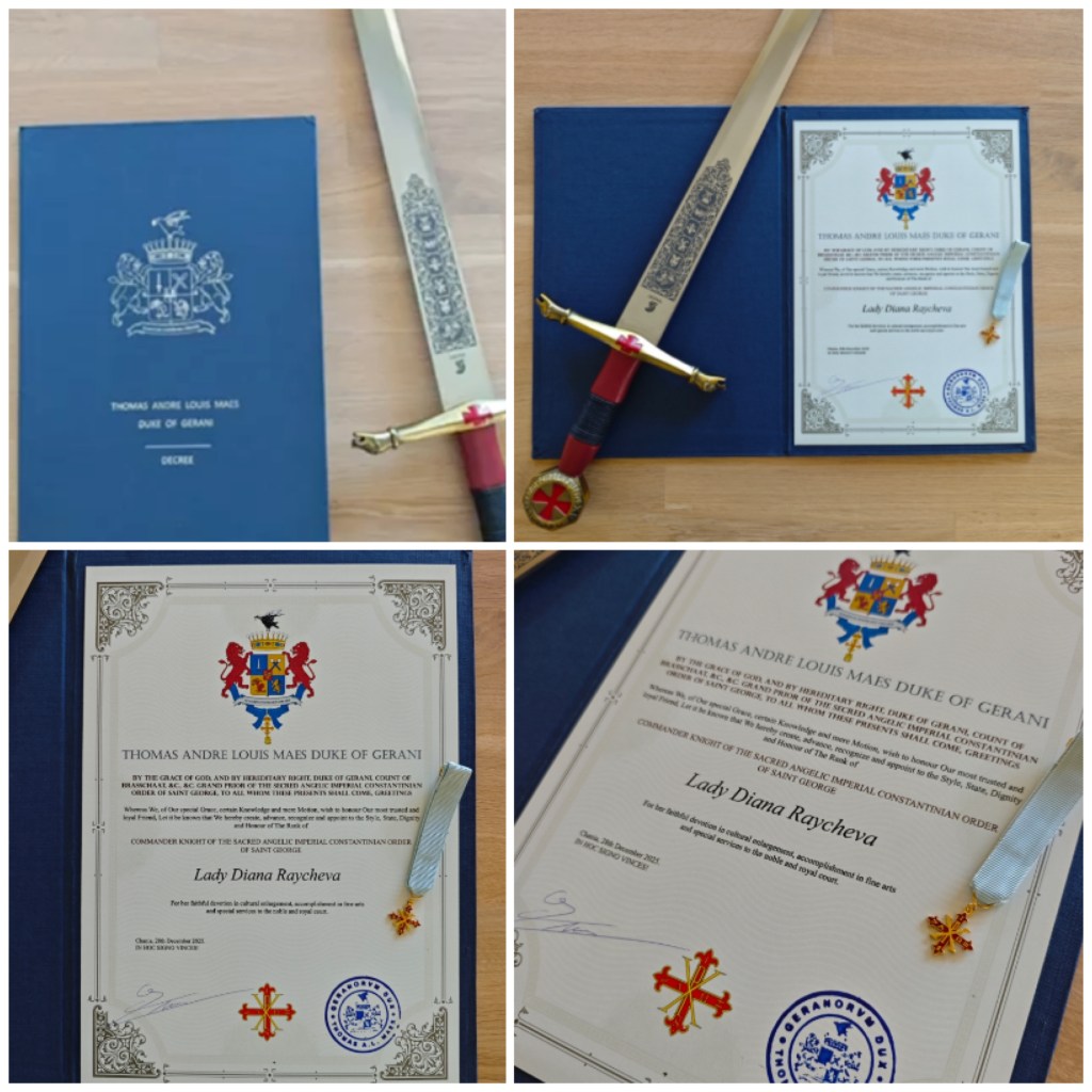 2025: RECOGNITION AWARD| Diploma – Knighthood decree ‘’LADY DIANA RAYCHEVA’’ honored with the appointment as Knight Commander of the Sacred Imperial Constantinian Angelic Order of Saint George, bestowed by Duke Dr. Thomas André Louis Maes, Count of Brasschaat, Consul, Duke of Gerani, and CEO of World of Crete, Chania, Greece. With this distinction, Diana was granted the title “Lady Diana Raycheva”, in recognition of her faithful devotion to cultural enrichment, accomplishments in the fine arts, and special services to the noble and royal court.