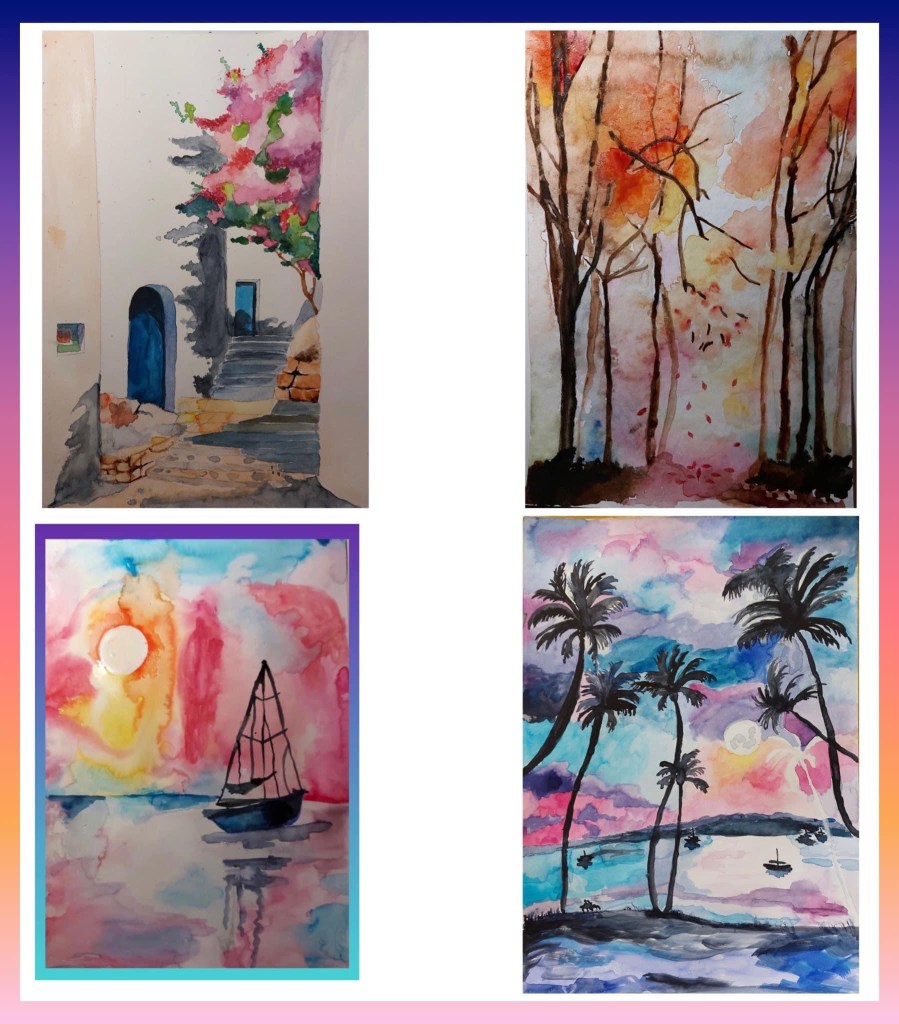 Book a workshop : Pouring technique, Gesso technique, Spray technique, Ink, Abstract painting, Watercolor painting, Acrylic painting, Mixed media technique, Oil and Dry pastels, Color pens, Sketching with pencils, Watercolor pencils, Spatula technique, Paint with fingers, Christmas post cards, Easter workshop inspirations, Summer inspirations, Van Gogh, Impressionism, Manga cartoon workshop, Harry Poter, How to paint animals, How to paint human body or face.